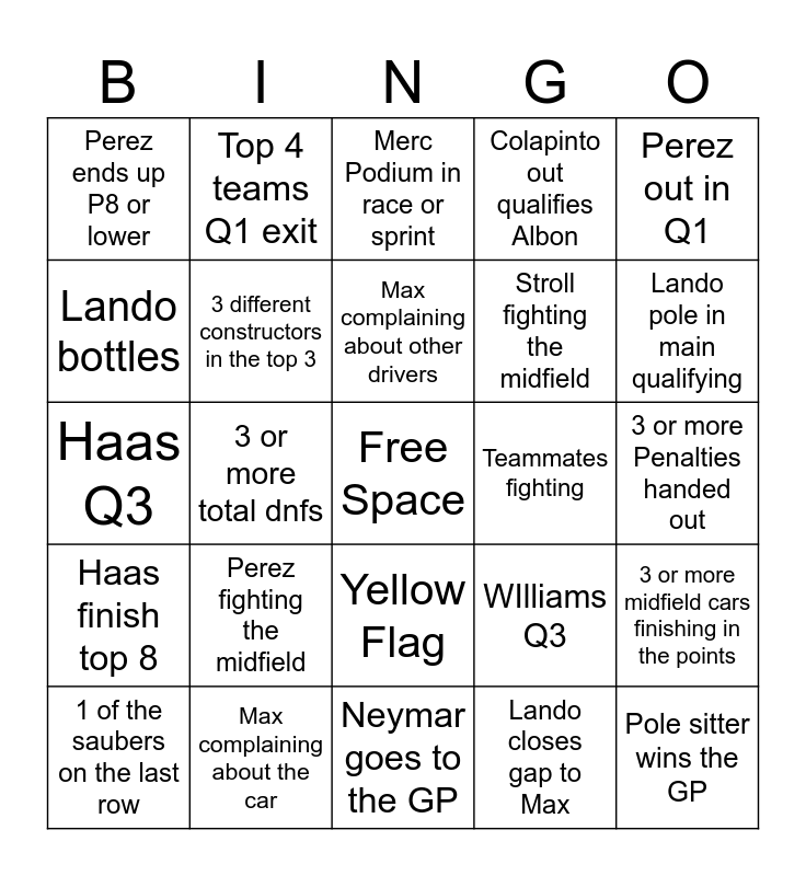 This bingo card has a free space and 24 words: Perez fighting the midfield, Max complaining about the car, Max complaining about other drivers, 1 of the saubers on the last row, Perez out in Q1, Perez ends up P8 or lower, Lando bottles, Top 4 teams Q1 exit, Teammates fighting, Yellow Flag, Stroll fighting the midfield, Haas Q3, WIlliams Q3, 3 or more midfield cars finishing in the points, 3 different constructors in the top 3, Lando closes gap to Max, 3 or more Penalties handed out, Merc Podium in race or sprint, Lando pole in main qualifying, 3 or more total dnfs, Pole sitter wins the GP, Haas finish top 8, Colapinto out qualifies Albon and Neymar goes to the GP.
