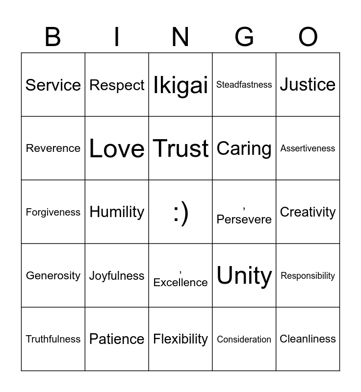 This bingo card has a free space and 24 words: Joyfulness, Patience, Trust, Truthfulness, Justice, Service, Reverence, Respect, , Persevere, , Excellence, Caring, Forgiveness, Unity, Responsibility, Love, Consideration, Creativity, Ikigai, Assertiveness, Humility, Cleanliness, Generosity, Steadfastness and Flexibility.