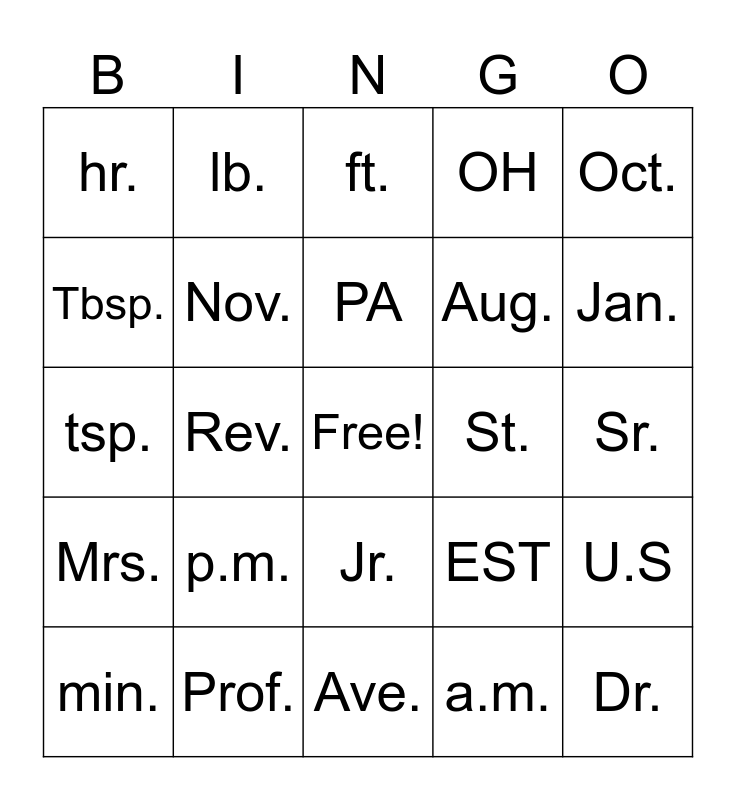 This bingo card has a free space and 29 words: min., Rd., Rev., Mr., hr., ft., Nov., p.m., St., Prof., Sr., Dr., Ave., a.m., Jan., Blvd., Jr., Mrs., Oct., tsp., EST, yd., Aug., Tbsp., OH, lb., U.S, PA and NY.
