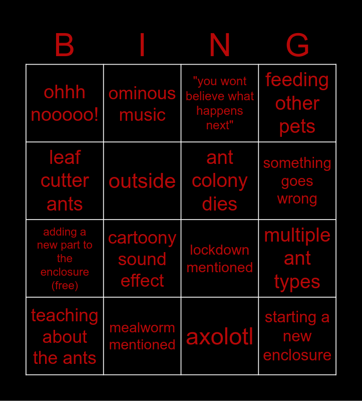 This bingo card has 20 words: multiple ant types, add for ant enclosures, "you wont believe what happens next", feeding of the ants, teaching about the ants, leaf cutter ants, mealworm mentioned, ohhh nooooo!, adding a new part to the enclosure (free), ominous music, cartoony sound effect, lockdown mentioned, outside, starting a new enclosure, ant colony dies, "comment down below what name you think it should have!", something goes wrong, feeding other pets, axolotl and red ant empire.
