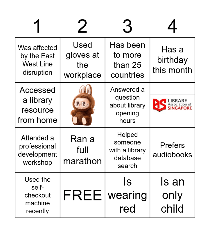 This bingo card has 2 images and 23 words: Talk to someone beside you, Had to tell someone about the copyright act, Talked to a library patron for 10 min, Accessed a library resource from home, Was affected by the East West Line disruption, Used gloves at the workplace, FREE, Has a book blog, Attended a professional development workshop, Helped someone with a library database search, Had a conversation about digital literacy, Had coffee/tea with a fellow librarian overseas, Answered a question about library opening hours, Helped someone find a quiet study space, Is wearing red, Has been to more than 25 countries, Ran a full marathon, Prefers audiobooks, Used the self-checkout machine recently, Made a new year's resolution and kept it, Is an only child, Has a birthday this month and Is left-handed.