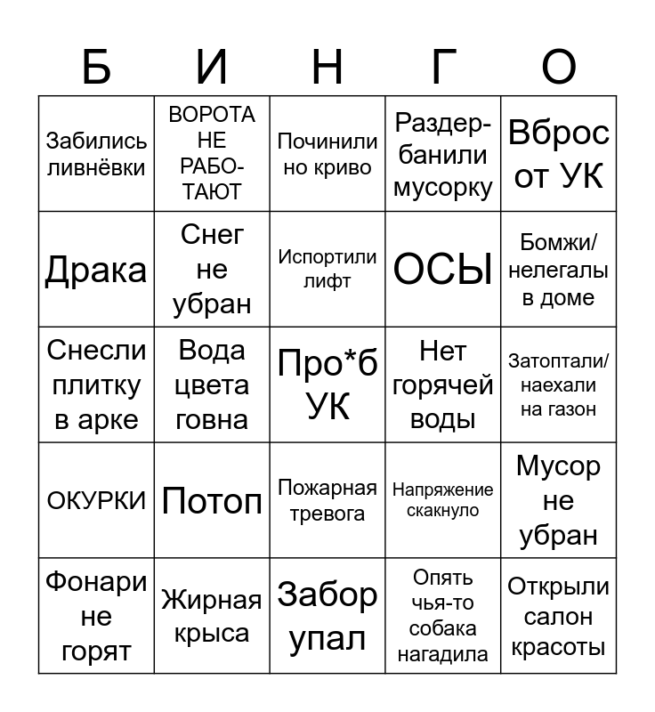 This bingo card has a free space and 24 words: Потоп, Жирная крыса, Испортили лифт, Фонари не горят, Вброс от УК, Забились ливнёвки, Драка, ВОРОТА НЕ РАБО-ТАЮТ, Нет горячей воды, Пожарная тревога, ОСЫ, Снесли плитку в арке, Напряжение скакнуло, Мусор не убран, Снег не убран, Опять чья-то собака нагадила, Затоптали/наехали на газон, Починили но криво, Бомжи/нелегалы в доме, Вода цвета говна, Открыли салон красоты, ОКУРКИ, Раздер-банили мусорку and Забор упал.