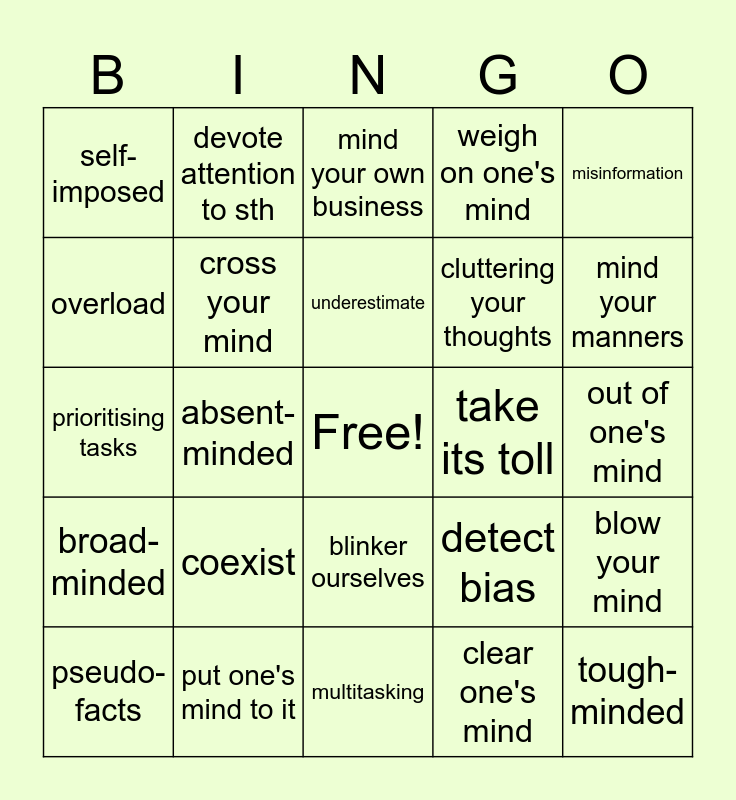This bingo card has a free space and 25 words: coexist, multitasking, underestimate, pseudo-facts, misinformation, self-imposed, overload, devote attention to sth, take its toll, blinker ourselves, cluttering your thoughts, prioritising tasks, detect bias, blow your mind, cross your mind, in two minds, out of one's mind, mind your own business, mind your manners, absent-minded, tough-minded, put one's mind to it, broad-minded, weigh on one's mind and clear one's mind.