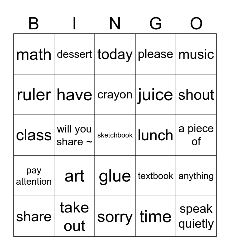 This bingo card has a free space and 24 words: art, take out, crayon, share, music, math, ruler, dessert, lunch, glue, juice, class, textbook, anything, have, time, a piece of, today, shout, will you share ~, speak quietly, pay attention, please and sorry.