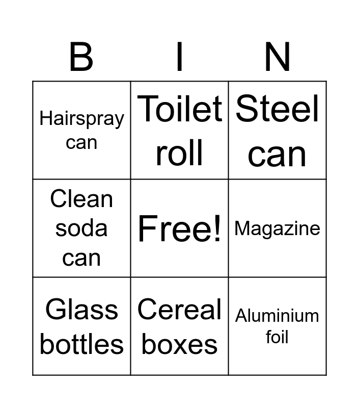 This bingo card has a free space and 8 words: Magazine, Steel can, Toilet roll, Glass bottles, Hairspray can, Aluminium foil, Clean soda can and Cereal boxes.