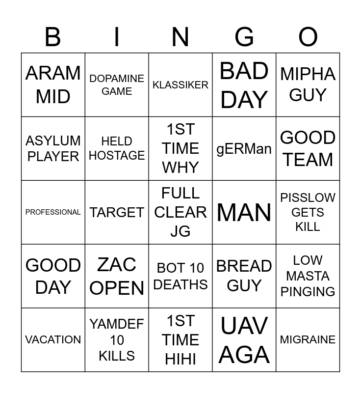 This bingo card has a free space and 24 words: ZAC OPEN, YAMDEF 10 KILLS, 1ST TIME WHY, VACATION, MIPHA GUY, ARAM MID, ASYLUM PLAYER, DOPAMINE GAME, MAN, BOT 10 DEATHS, gERMan, PROFESSIONAL, BREAD GUY, LOW MASTA PINGING, HELD HOSTAGE, UAV AGA, PISSLOW GETS KILL, KLASSIKER, GOOD TEAM, TARGET, MIGRAINE, GOOD DAY, BAD DAY and 1ST TIME HIHI.