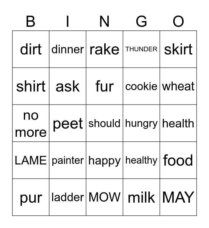 This bingo card has a free space and 24 words: painter, ladder, fur, pur, skirt, dirt, shirt, dinner, hungry, happy, cookie, no more, healthy, food, ask, milk, health, rake, wheat, peet, MAY, LAME, THUNDER and MOW.