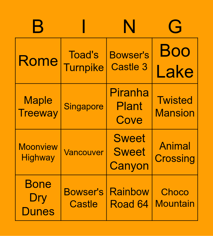 This bingo card has 16 words: Bowser's Castle, Animal Crossing, Bowser's Castle 3, Rome, Moonview Highway, Toad's Turnpike, Sweet Sweet Canyon, Rainbow Road 64, Maple Treeway, Singapore, Bone Dry Dunes, Boo Lake, Vancouver, Twisted Mansion, Piranha Plant Cove and Choco Mountain.