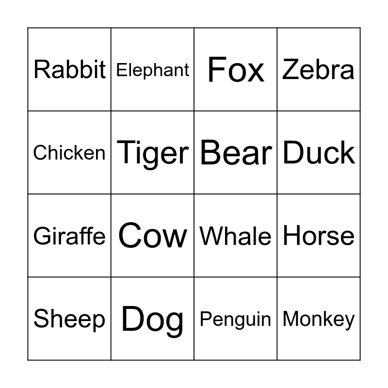 This bingo card has 22 words: Dog, Cat, Elephant, Lion, Tiger, Bear, Rabbit, Fox, Whale, Monkey, Giraffe, Zebra, Kangaroo, Dolphin, Penguin, Snake, Horse, Sheep, Cow, Chicken, Duck and Owl.