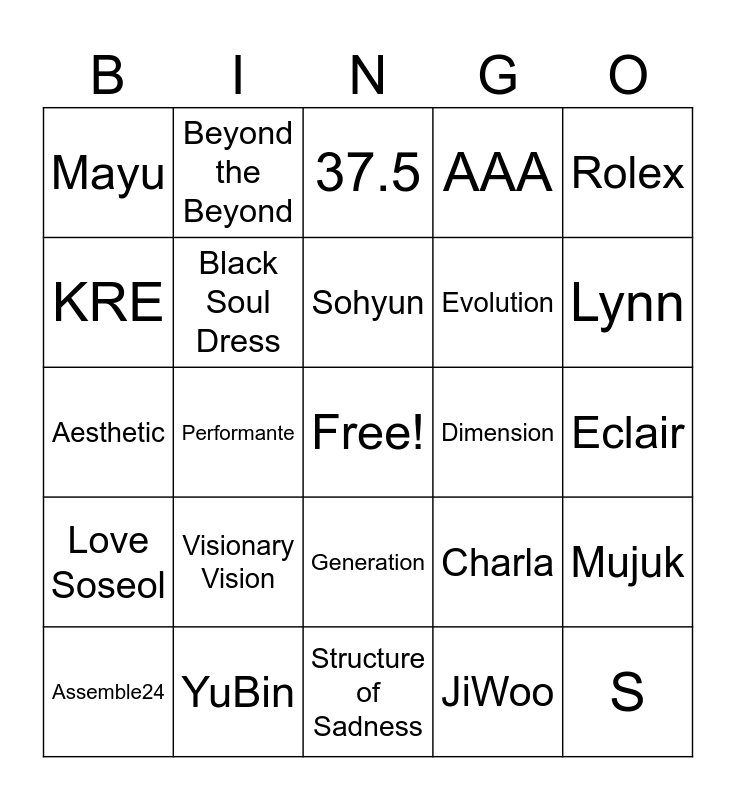 This bingo card has a free space and 95 words: Seoyeon, Hyerin, JiWoo, ChaeYeon, Yooyeon, SooMin, Nakyoung, YuBin, Kaede, DaHyun, Kotone, Yeonji, Nien, Sohyun, Xinyu, Mayu, Lynn, JooBin, Hayeon, Shion, Chaewon, Sullin, SeoAh, JiYeon, AAA, KRE, Lovelution, Evolution, Aria, Hachi, Visionary Vision, NXT, GLOW, Assemble10, Assemble24, Acid Eyes, Structure of Sadness, Access, Aesthetic, Muhan, Mujuk, Performante, Generation, Rolex, Charla, Dimension, +(82), Cherry Talk, Touch, Hide & Seek, Deja-vu, Beam, Before the Rise, Rising, Colorful, The Baddest, New Look, Chowall, Girls' Capitalism, Complexity, Black Soul Dress, Seoul Sonyo Sound, Cry Baby, Speed Love, Number 8, Invincible, Rhodanthe, Heavy Metal Wings, 37.5, Moto Princess, Oui, Enhanced Flower, S, GND, Heart Raider, Midnight Flower, White Soul Sneakers, Chiyu, 24, Beyond the Beyond, Non Scale, Visual Virtue, Hit the Floor, Choom, Eclair, Love Soseol, Atmosphere, 12 Rings, Vision, Bionic Power, Cherry Gene, ###, Inner Dance, Just Do It and Jaden Jeong.