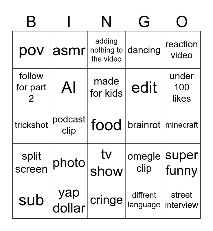 This bingo card has 25 words: split screen, yap dollar, food, diffrent language, reaction video, pov, asmr, adding nothing to the video, brainrot, super funny, follow for part 2, AI, cringe, omegle clip, under 100 likes, sub, podcast clip, made for kids, edit, minecraft, trickshot, photo, tv show, dancing and street interview.