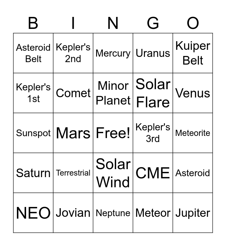 This bingo card has a free space and 24 words: Terrestrial, Jovian, Minor Planet, NEO, Kuiper Belt, Asteroid Belt, Kepler's 1st, Kepler's 2nd, Kepler's 3rd, Solar Wind, Solar Flare, Sunspot, CME, Asteroid, Comet, Meteor, Meteorite, Mercury, Venus, Mars, Jupiter, Saturn, Uranus and Neptune.