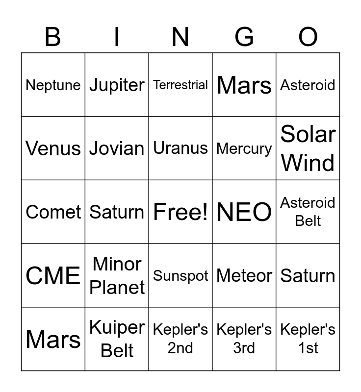 This bingo card has a free space and 29 words: Mars, Jupiter, Saturn, Uranus, Neptune, Terrestrial, Jovian, Minor Planet, NEO, Kuiper Belt, Asteroid Belt, Kepler's 1st, Kepler's 2nd, Kepler's 3rd, Solar Wind, Solar Flare, Sunspot, CME, Asteroid, Comet, Meteor, Meteorite, Mercury, Venus, Mars, Jupiter, Saturn, Uranus and Neptune.