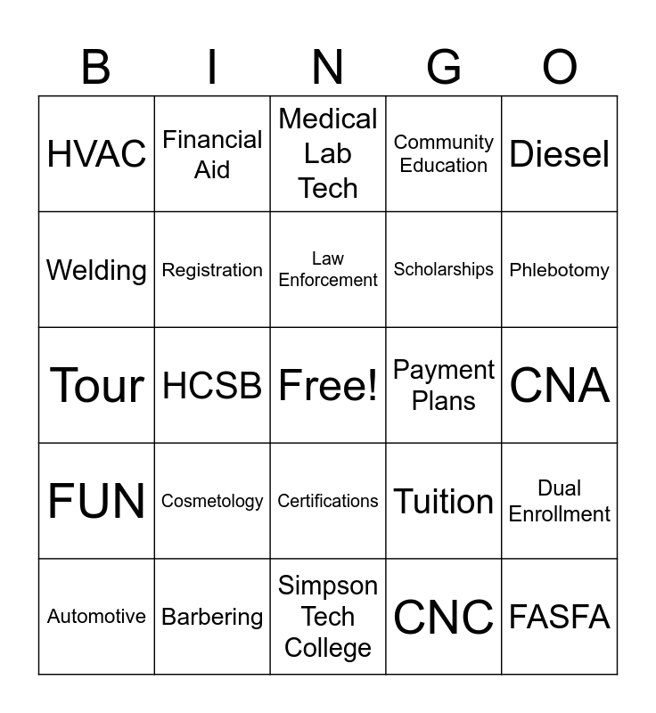 This bingo card has a free space and 24 words: Cosmetology, Barbering, Law Enforcement, Automotive, Diesel, HVAC, Welding, Financial Aid, Payment Plans, Certifications, Scholarships, Tour, Tuition, Dual Enrollment, Registration, CNC, CNA, Medical Lab Tech, Phlebotomy, HCSB, FASFA, FUN, Community Education and Simpson Tech College.