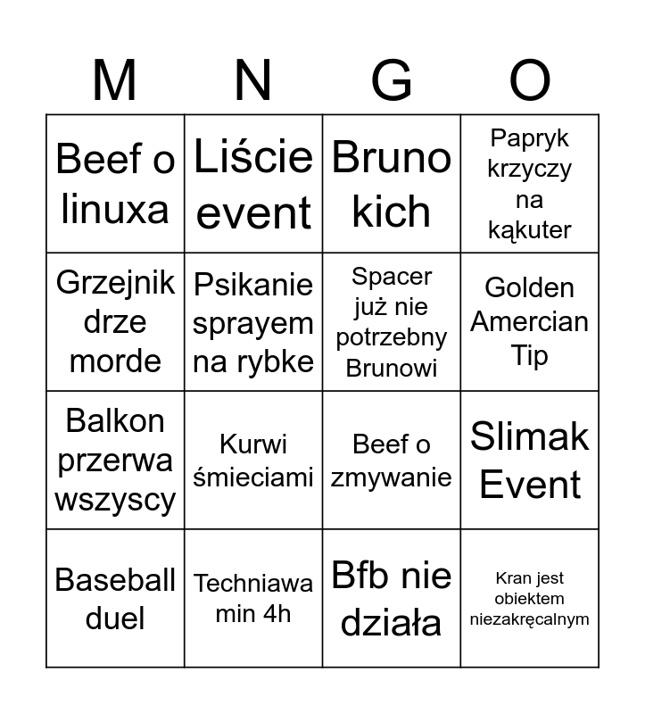 This bingo card has 16 words: Techniawa min 4h, Slimak Event, Bruno kich, Beef o linuxa, Balkon przerwa wszyscy, Liście event, Beef o zmywanie, Bfb nie działa, Grzejnik drze morde, Psikanie sprayem na rybke, Baseball duel, Papryk krzyczy na kąkuter, Kurwi śmieciami, Golden Amercian Tip, Spacer już nie potrzebny Brunowi and Kran jest obiektem niezakręcalnym.