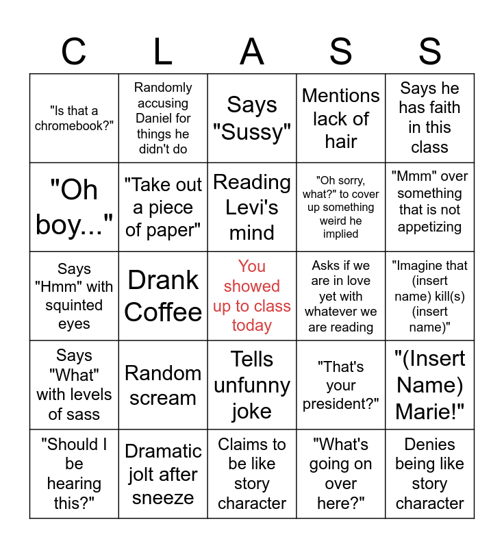 This bingo card has a free space and 34 words: Dr. Dan dances/approaches strangely, "What's going on over here?", Talks about Juniors, "I probably shouldn't show this", Says "What" with levels of sass, "Take out a piece of paper", Says he has faith in this class, "Should I be hearing this?", Randomly accusing Daniel for things he didn't do, Upset over Chemistry, Reading Levi's mind, Says "Sussy", "Don't Care", No longer has faith in this class, Asks if we are in love yet with whatever we are reading, "Mmm" over something that is not appetizing, Dramatic jolt after sneeze, Says "Hmm" with squinted eyes, Random scream, "That's your president?", Tells unfunny joke, "Kloke!", "Is that a chromebook?", "Imagine that (insert name) kill(s) (insert name)", Claims to be like story character, Denies being like story character, Mentions lack of hair, Recounts tragic tale he experienced, "Oh sorry, what?" to cover up something weird he implied, "Oh boy...", Gasps over something unsurprising, Drank Coffee, "(Insert Name) Marie!" and Complains about 2 step verification.