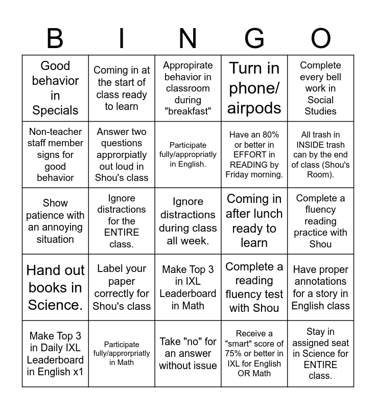 This bingo card has a free space and 24 words: Label your paper correctly for Shou's class, Participate fully/approrpriatly in Math, Participate fully/appropriatly in English., Make Top 3 in Daily IXL Leaderboard in English x1, Complete every bell work in Social Studies, Good behavior in Specials, Non-teacher staff member signs for good behavior, Coming in at the start of class ready to learn, Coming in after lunch ready to learn, Make Top 3 in IXL Leaderboard in Math, Have an 80% or better in EFFORT in READING by Friday morning., Show patience with an annoying situation, Complete a reading fluency test with Shou, Have proper annotations for a story in English class, Answer two questions approrpiatly out loud in Shou's class, Receive a "smart" score of 75% or better in IXL for English OR Math, Complete a fluency reading practice with Shou, Appropirate behavior in classroom during "breakfast", All trash in INSIDE trash can by the end of class (Shou's Room)., Ignore distractions for the ENTIRE class., Stay in assigned seat in Science for ENTIRE class., Hand out books in Science., Turn in phone/ airpods and Take "no" for an answer without issue.