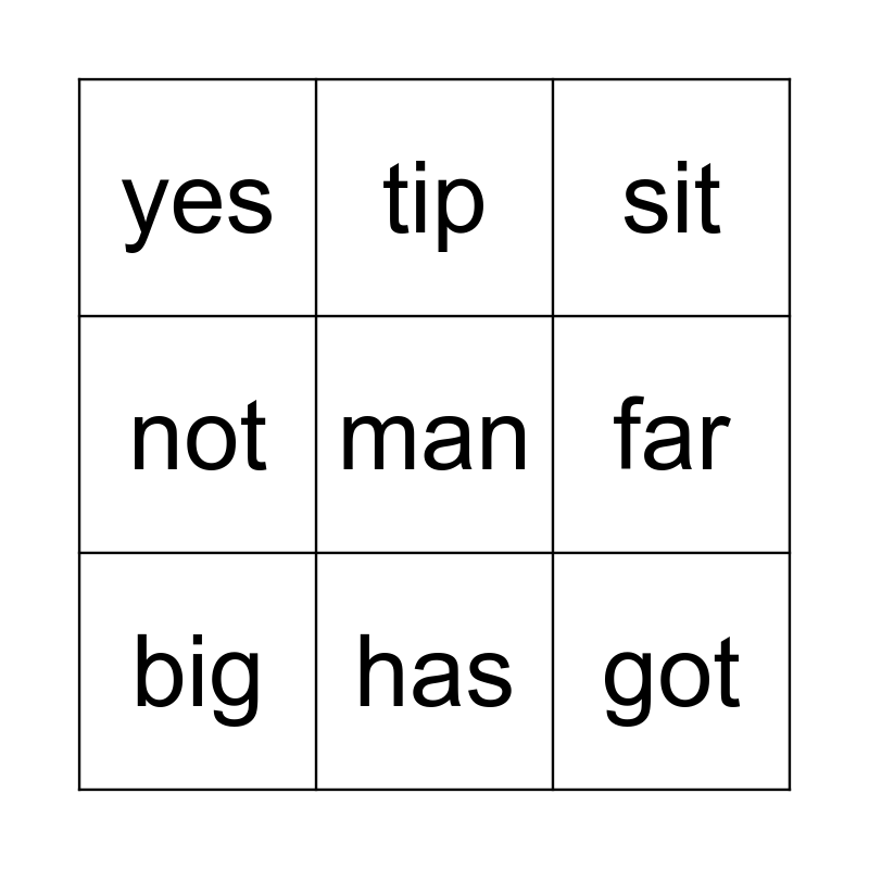 This bingo card has 9 words: big, sit, tip, not, yes, far, man, got and has.