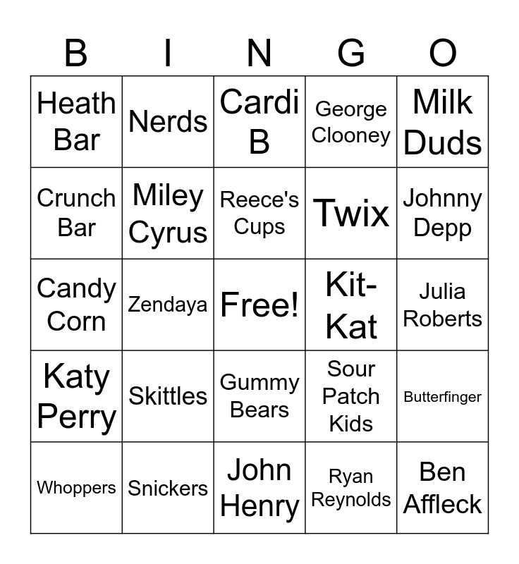 This bingo card has a free space and 24 words: Skittles, Snickers, Reece's Cups, Whoppers, Milk Duds, Heath Bar, Crunch Bar, Nerds, Kit-Kat, Gummy Bears, Twix, Candy Corn, Sour Patch Kids, Butterfinger, Miley Cyrus, Ryan Reynolds, Julia Roberts, Cardi B, Johnny Depp, Zendaya, Ben Affleck, Katy Perry, George Clooney and John Henry.