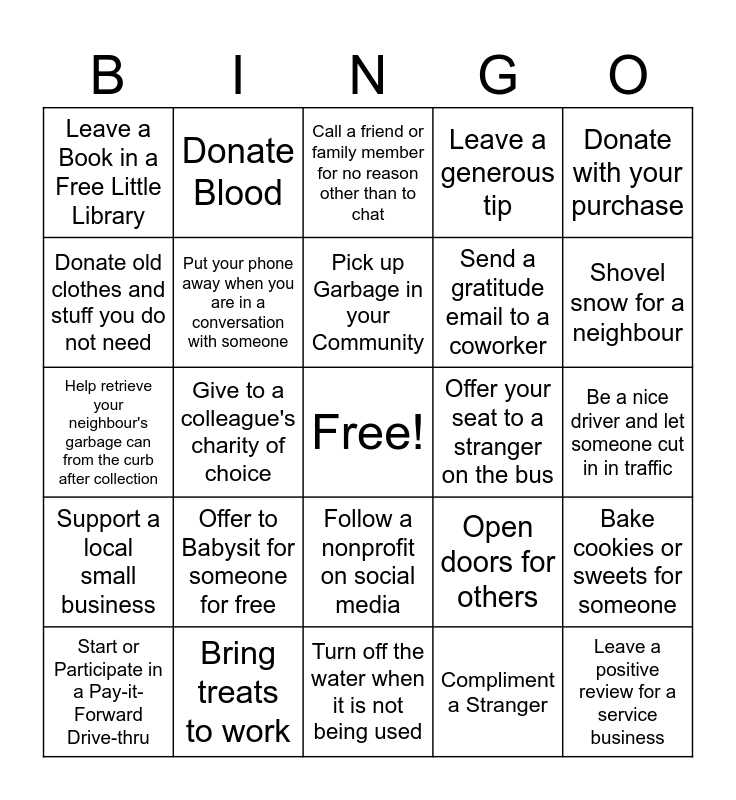 This bingo card has a free space and 24 words: Start or Participate in a Pay-it-Forward Drive-thru, Offer to Babysit for someone for free, Pick up Garbage in your Community, Compliment a Stranger, Donate with your purchase, Leave a Book in a Free Little Library, Donate Blood, Call a friend or family member for no reason other than to chat, Offer your seat to a stranger on the bus, Be a nice driver and let someone cut in in traffic, Help retrieve your neighbour's garbage can from the curb after collection, Put your phone away when you are in a conversation with someone, Open doors for others, Bake cookies or sweets for someone, Donate old clothes and stuff you do not need, Bring treats to work, Turn off the water when it is not being used, Leave a generous tip, Shovel snow for a neighbour, Support a local small business, Give to a colleague's charity of choice, Follow a nonprofit on social media, Send a gratitude email to a coworker and Leave a positive review for a service business.