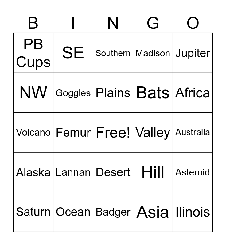 This bingo card has a free space and 24 words: Lannan, Ocean, Plains, Saturn, Jupiter, PB Cups, NW, SE, Valley, Desert, Bats, Volcano, Hill, Asteroid, Goggles, Asia, Australia, Southern, Africa, Femur, Ilinois, Alaska, Madison and Badger.