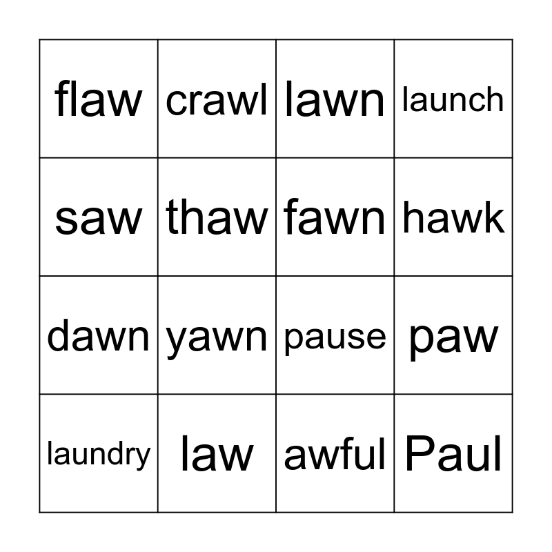 This bingo card has 24 words: raw, claw, hawk, straw, saw, flaw, thaw, crawl, law, hawk, dawn, pause, jaw, draw, fawn, fault, awful, lawn, yawn, paw, laundry, Paul, launch and author.
