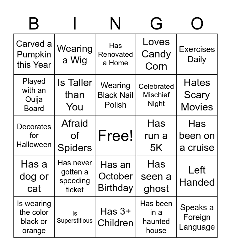 This bingo card has a free space and 29 words: Is wearing the color black or orange, Loves Scary Movies, Afraid of Spiders, Likes to Read Murder Mysteries, Carved a Pumpkin this Year, Has Renovated a Home, Is Taller than You, Has never gotten a speeding ticket, Has run a 5K, Is Superstitious, Has been on a cruise, Speaks a Foreign Language, Has 3+ Children, Has been in a haunted house, Hates Scary Movies, Loves Pumpkin Spice, Has an October Birthday, Has a dog or cat, Exercises Daily, Decorates for Halloween, Has seen a ghost, Gives out full sized candy bars, Celebrated Mischief Night, Played with an Ouija Board, Loves Candy Corn, Wearing a Wig, Left Handed, Wearing Black Nail Polish and Wearing a mask.