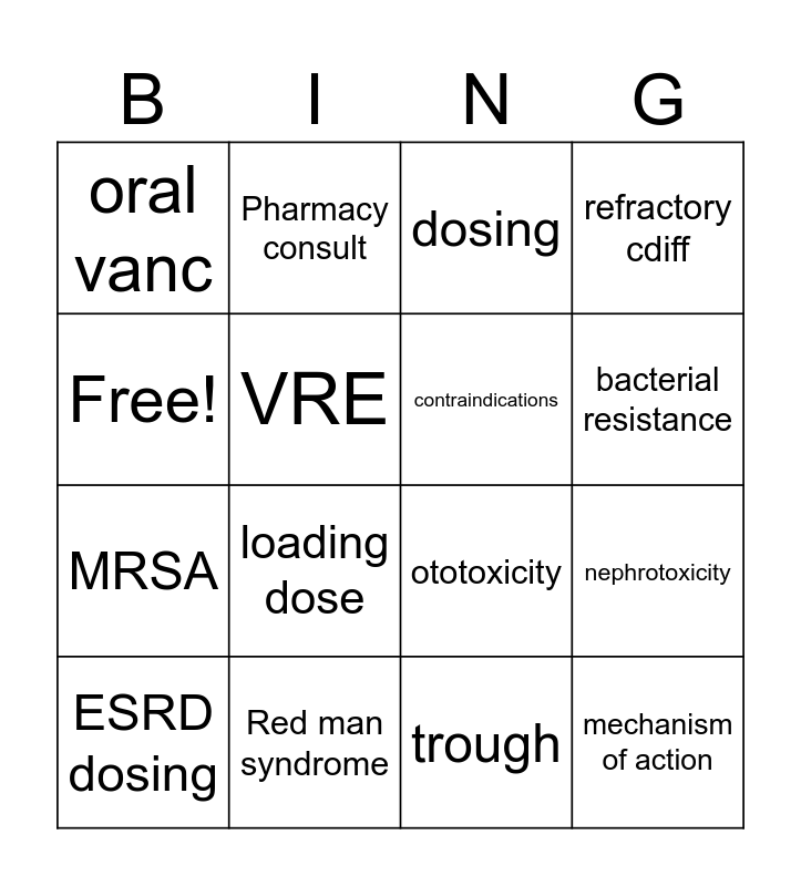 This bingo card has 16 words: Red man syndrome, nephrotoxicity, dosing, oral vanc, MRSA, Pharmacy consult, ototoxicity, trough, Free!, VRE, ESRD dosing, refractory cdiff, loading dose, bacterial resistance, contraindications and mechanism of action.