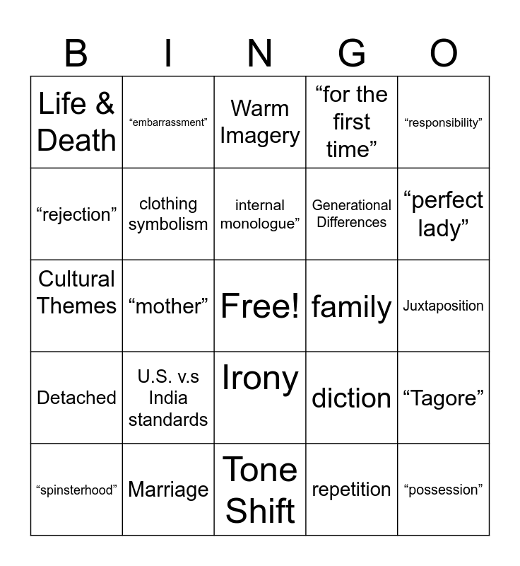 This bingo card has a free space and 24 words: U.S. v.s India standards, Marriage, internal monologue”, “spinsterhood”, “responsibility”, Life & Death, “rejection”, “embarrassment”, family, Irony, Generational Differences, Cultural Themes, diction, “Tagore”, clothing symbolism, repetition, Juxtaposition, Warm Imagery, “perfect lady”, “mother”, “possession”, Detached, “for the first time” and Tone Shift.