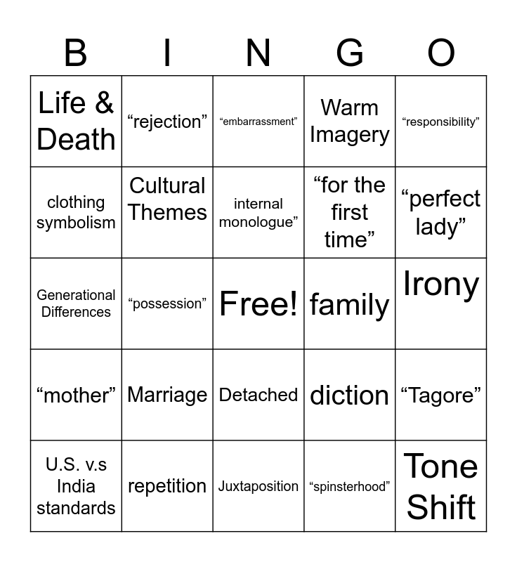 This bingo card has a free space and 24 words: U.S. v.s India standards, Marriage, internal monologue”, “spinsterhood”, “responsibility”, Life & Death, “rejection”, “embarrassment”, family, Irony, Generational Differences, Cultural Themes, diction, “Tagore”, clothing symbolism, repetition, Juxtaposition, Warm Imagery, “perfect lady”, “mother”, “possession”, Detached, “for the first time” and Tone Shift.