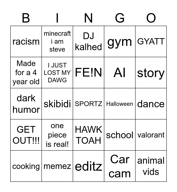 This bingo card has a free space and 24 words: one piece is real!, memez, FE!N, cooking, GYATT, racism, Made for a 4 year old, minecraft i am steve, Halloween, HAWK TOAH, AI, dark humor, school, valorant, I JUST LOST MY DAWG, Car cam, dance, DJ kalhed, story, skibidi, animal vids, GET OUT!!!, gym and editz.