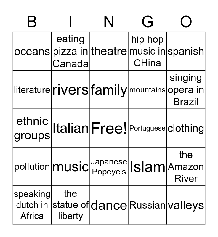 This bingo card has a free space and 24 words: music, the statue of liberty, family, speaking dutch in Africa, spanish, oceans, literature, eating pizza in Canada, Portuguese, Japanese Popeye's, mountains, ethnic groups, Islam, the Amazon River, rivers, Russian, clothing, theatre, singing opera in Brazil, Italian, valleys, pollution, hip hop music in CHina and dance.