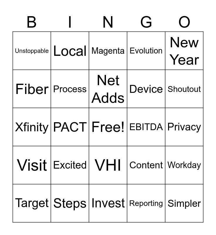 This bingo card has a free space and 375 words: 2024, #1, ACP, Action, Actions, Additions, Ads, Advantage, Agent, Ahorrar, AI, Align, All, Amazing, Ambassador, Anticipating, App, Aspiring, Assets, AT&T, Attend, Authentic, Automation, Balance, Base, Benefits, Best, Best Buy, Best in Class, Better, Bid, Boujee, Brand, Broadband, Bumpy, Bundle, Business, Busy, C-band, Call, Capacity, Capital, Car, Career, Cash Flow, Celebrate, CERS, Change, Chat, Choice, Churn, Citizens, Clients, Collaboration, Common, Communication, Community, Competition, Confidence, Connect, Connected, Connection, Connectivity, Consumer, Content, Contract, Control, Conversation, Copper, Core, Corporate, Coverage, Create, Creativity, Credit, Credo, Critical, Culture, Curriculum, Customer, Customer Care, CX, Data, Deal, Decrease, Deliver, Device, Devices, Digital, Dinner Table, Direction, Disasters, Discount, Distraction, Distribution, Diversity, Drumroll, Earn, EBITDA, Efficiency, Election, Employees, Empowerment, Energy, Engage, Environment, Equipment, ERG, ERT, Escalation, Events, Evolution, Excited, Exciting, Experience, Extend, Fair, Fallout, Familia, Family, Fast, FCR, Feedback, Fiber, Field, Finance, FIOS, Fire, First, Focus, Focus, Footprint, Foundation, Foundational, Fresh, Friends and Family, Frontier, Frontline, FWA, Gathering, Gift Card, Gig, Goals, Government, Green, Gross Add, Grow, GTS, Guest, Hans, High, Home, Homes, HR, Hub, Human, Hurricane, Ideas, Imagine, Impact, Import, Importance, Important, Improvement, Individual, Interaction, Internal, Invest, Invest, IT, IVR, JG, Job, Journey, Kickoff, L&D, Latino, Launch, Lead, Leadership, Legal, Lisa, Living, Local, Loss, Love, Loyalty, Magenta, Magic, Market, Marketing, Member, Messages, Mobile, Model, Momentum, More, Most, Nancy, Net Adds, Network, New, New Year, News, Next, No, Nosotros, NPS, Objectives, Offerings, Office, One, Options, Outage, Outcomes, PACT, Participate, Participation, Partners, Partnership, People, Performance, Perks, Personal, Personalization, Phone, Plans, Policy, Positive, Power, Practice, Preformance, Premium, Prepaid, Prepare, Price, Priorities, Prioritization, Prioritize, Priority, Privacy, Problems, Process, Products, Promo, Promotions, Protect, Protection, Proud, PSO, Purpose, Quarter, Questions, Radio, Ramp, Real, Recognition, Recognize, Recommend, Red, Reduce, Relationship, Reliability, Reporting, Representation, Research, Resolution, Resources, Respect, Results, Retain, Retention, Revenue, Risk, Roadmap, Rockstar, Sales, Sam, Sampath, Samsung, Save, Savings, Scale, Scope, Security, Segment, Sell, Serve, Service, Services, Share, Share Price, Shoutout, Simple, Simpler, Single, Sites, Slido, Small, Smart, Society, Solve, Somos, Sound, Space, Spectrum, Spirit, Stakeholder, Start, Steps, Stocks, Store, Straight Talk, Strategy, Streaming, Strong, Subscription, Subsidy, Success, Successes, Sunday Ticket, Supply, Support, Survey, Systems, T-Mobile, Table, Talent, Target, Targets, Tea, Team, Teamwork, Technology, Test, Test Force, Thank you, Think, Tier, Todos los dias, Together, Tools, Towers, Trade In, Training, Transform, Transformation, Transparency, Trust, Ultra, Understand, Unstoppable, Value, VCG, Verizon, VGS, VHI, Video, View Together, Visit, Volunteer, Vteam, VZWeb, Walmart, Wellness, Why, WiFi, Win, Winner, Wireless, Work, Workday, Xbox, Xfinity and Yes.