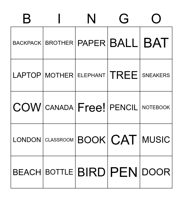 This bingo card has a free space and 39 words: APPLE, CHAIR, DOG, MOTHER, BEACH, BOOK, ELEPHANT, HOUSE, BAT, LONDON, CANADA, BALL, DOOR, NOTEBOOK, PENCIL, CLASSROOM, TEACHER, BACKPACK, STUDENT, CAT, LAPTOP, BIRD, TREE, SNEAKERS, KANGAROO, CELPHONE, SCHOOL, CRAYONS, PRINCIPAL, BROTHER, NEW ZEALAND, FISH, PAPER, BOTTLE, PEN, HORSE, MUSIC, COW and RESTAURANT.