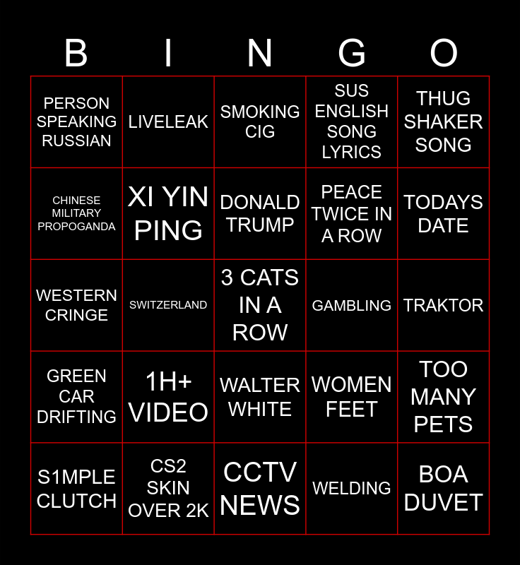 This bingo card has a free space and 24 words: 1H+ VIDEO, CS2 SKIN OVER 2K, DONALD TRUMP, S1MPLE CLUTCH, THUG SHAKER SONG, PERSON SPEAKING RUSSIAN, CHINESE MILITARY PROPOGANDA, LIVELEAK, GAMBLING, WALTER WHITE, PEACE TWICE IN A ROW, WESTERN CRINGE, WOMEN FEET, TOO MANY PETS, XI YIN PING, WELDING, TRAKTOR, SMOKING CIG, TODAYS DATE, SWITZERLAND, BOA DUVET, GREEN CAR DRIFTING, SUS ENGLISH SONG LYRICS and CCTV NEWS.