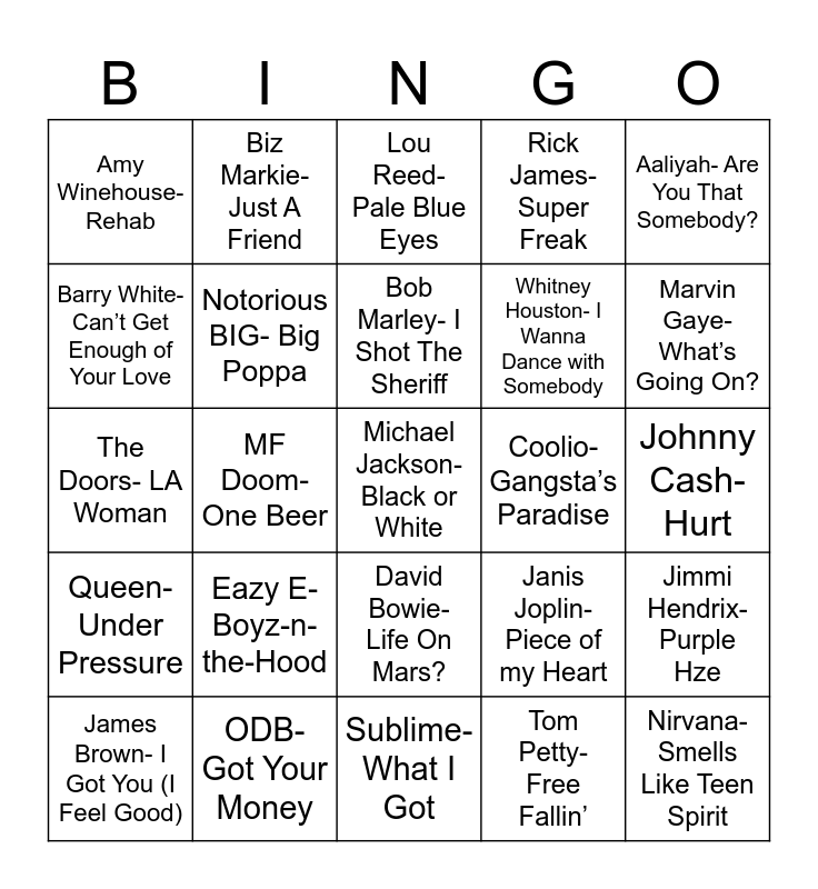 This bingo card has 25 words: Eazy E- Boyz-n-the-Hood, Sublime- What I Got, Bob Marley- I Shot The Sheriff, James Brown- I Got You (I Feel Good), Aaliyah- Are You That Somebody?, Amy Winehouse- Rehab, Barry White- Can’t Get Enough of Your Love, Biz Markie- Just A Friend, Coolio- Gangsta’s Paradise, David Bowie- Life On Mars?, Whitney Houston- I Wanna Dance with Somebody, The Doors- LA Woman, Janis Joplin- Piece of my Heart, Jimmi Hendrix- Purple Hze, Notorious BIG- Big Poppa, Nirvana- Smells Like Teen Spirit, Johnny Cash- Hurt, Lou Reed- Pale Blue Eyes, Marvin Gaye- What’s Going On?, MF Doom- One Beer, Michael Jackson- Black or White, ODB- Got Your Money, Queen- Under Pressure, Rick James- Super Freak and Tom Petty- Free Fallin’.