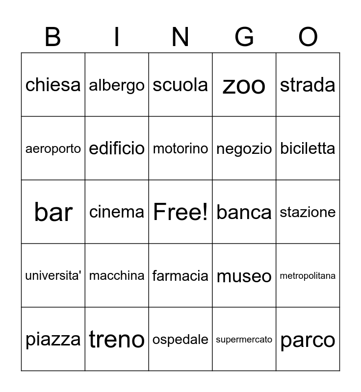 This bingo card has a free space and 29 words: piazza, autobus, cinema, stadio, chiesa, scuola, edificio, macchina, banca, treno, stazione, parco, ospedale, supermercato, biciletta, ristorante, farmacia, universita', strada, bar, museo, teatro, negozio, aeroporto, zoo, albergo, metropolitana, motorino and traffico.
