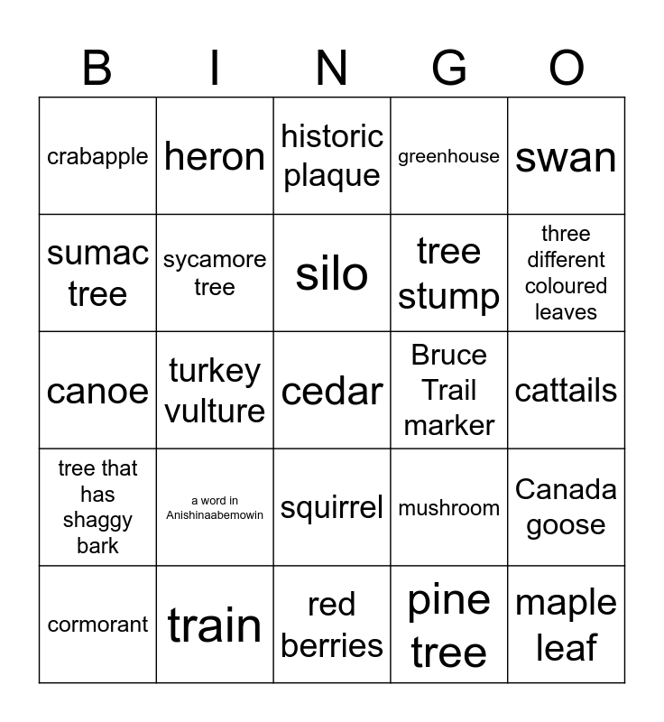 This bingo card has 34 words: maple leaf, pine tree, acorn, pine cone, tree that has shaggy bark, sycamore tree, swan, cormorant, heron, egret, silo, historic plaque, lilac tree, RBG employee, Bruce Trail marker, three different coloured leaves, train, canoe, a word in Anishinaabemowin, mushroom, squirrel, chipmunk, crabapple, cattails, red berries, cedar, greenhouse, stream, tree stump, sumac tree, giant paw-paw leaf, turkey vulture, Canada goose and tree that has smooth bark.