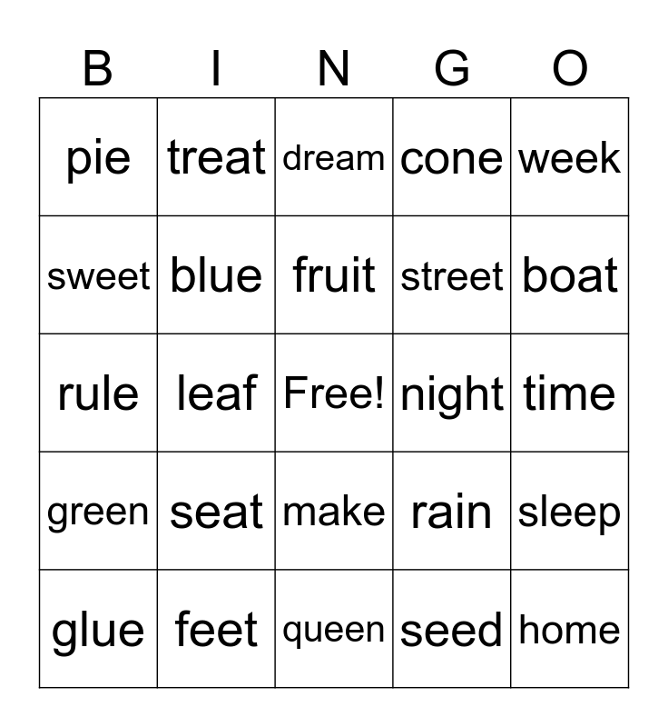 This bingo card has a free space and 24 words: seat, feet, fruit, glue, week, pie, sweet, treat, night, make, street, rule, rain, sleep, blue, seed, time, dream, boat, leaf, home, green, cone and queen.