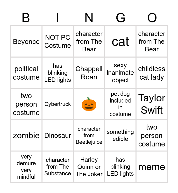 ⚠ This card has duplicate items: Moo Deng (2), Raygun Aussie Breakdancer (2), two person costume (2), three person costume (2), NOT PC Costume (2), RJK Jr’s brain worm (2), Chappell Roan (2), character from The Substance (2), character from Beetlejuice (2), character from Dune (2), Taylor Swift (2), character from The Bear (2), House of the Dragon (2), political costume (2), Cybertruck (2), Beyonce (2), sexy inanimate object (2), zombie (2), cat (2), has blinking LED lights (2), pet dog included in costume (2), religious figure (2), spider or insect (2), childless cat lady (2), character from the 1980s (2), meme (2), famous painting or art (2)