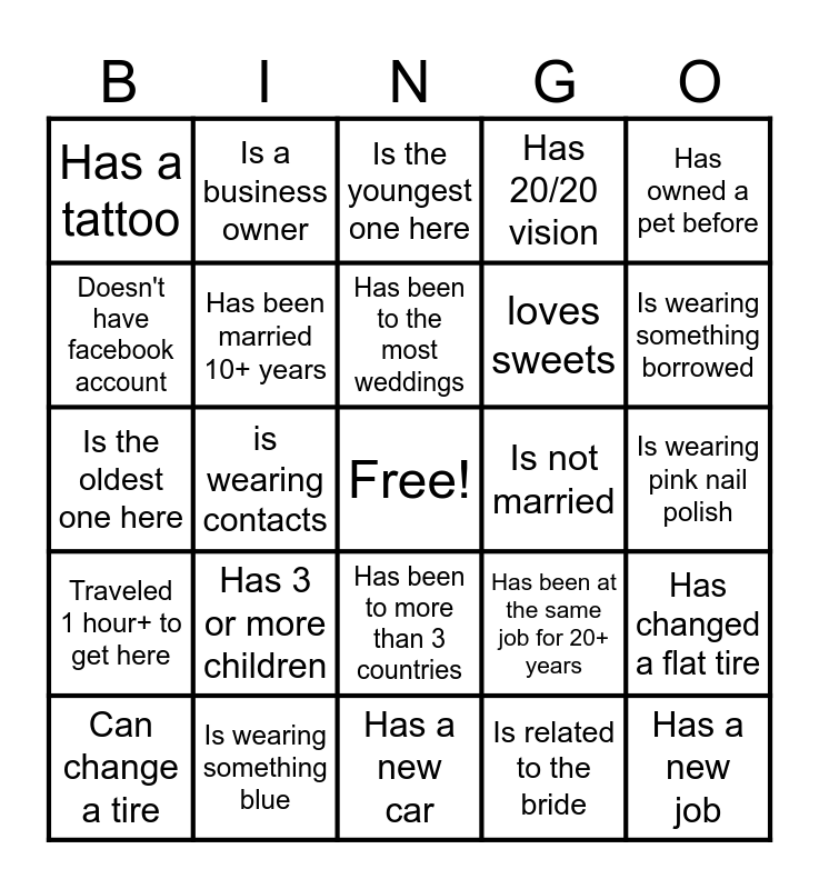This bingo card has a free space and 34 words: Is left-handed, Is related to the bride, Is wearing contacts, Can speak more than 1 language, Traveled 1 hour+ to get here, Has been married 10+ years, Has owned a pet before, Can change a tire, Is a business owner, Is engaged, Has been to the most weddings, Is the youngest one here, Went to school with the bride, Is a vegetarian or vegan, Is not married, Is wearing something borrowed, Is wearing something blue, Is the oldest one here, Has 3 or more children, Has been at the same job for 20+ years, Has been to more than 3 countries, Has the same shoe size as you, Has a tattoo, Is wearing pink nail polish, Has a new car, Has a new job, Has 20/20 vision, Drinks Chai, loves sweets, Doesn't have facebook account, Snores while they sleep, is wearing contacts, Has changed a flat tire and Shares the same birthday month.