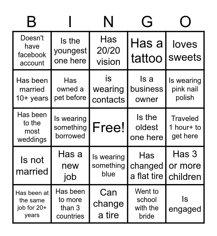 This bingo card has a free space and 34 words: Is left-handed, Is related to the bride, Is wearing contacts, Can speak more than 1 language, Traveled 1 hour+ to get here, Has been married 10+ years, Has owned a pet before, Can change a tire, Is a business owner, Is engaged, Has been to the most weddings, Is the youngest one here, Went to school with the bride, Is a vegetarian or vegan, Is not married, Is wearing something borrowed, Is wearing something blue, Is the oldest one here, Has 3 or more children, Has been at the same job for 20+ years, Has been to more than 3 countries, Has the same shoe size as you, Has a tattoo, Is wearing pink nail polish, Has a new car, Has a new job, Has 20/20 vision, Drinks Chai, loves sweets, Doesn't have facebook account, Snores while they sleep, is wearing contacts, Has changed a flat tire and Shares the same birthday month.