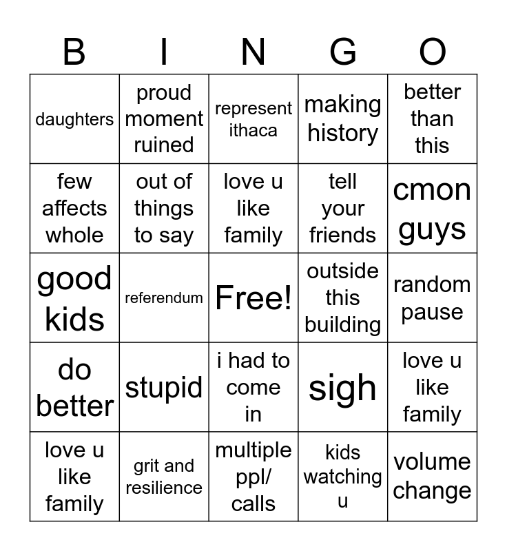 This bingo card has a free space and 29 words: love u like family, ithaca fam, referendum, his coaching, daughters, represent ithaca, out of things to say, stupid, outside this building, grit and resilience, random pause, volume change, multiple ppl/ calls, kids watching u, cmon guys, quotes, i had to come in, do better, better than this, good kids, sigh, head shake, tell your friends, few affects whole, making history, proud moment ruined, love u like family, love u like family and love u like family.