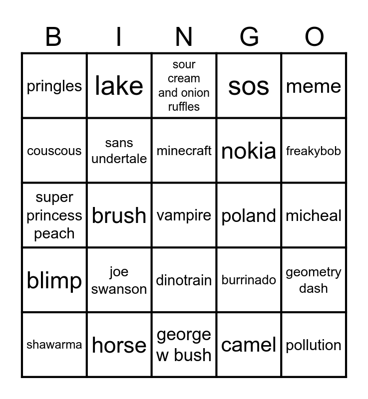 This bingo card has a free space and 24 words: joe swanson, horse, minecraft, shawarma, meme, pringles, couscous, lake, poland, dinotrain, nokia, super princess peach, burrinado, geometry dash, sans undertale, camel, micheal, sour cream and onion ruffles, freakybob, brush, pollution, blimp, sos and george w bush.
