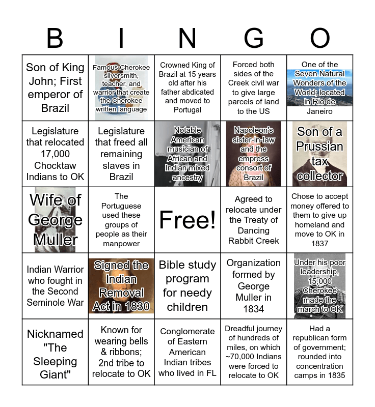 This bingo card has 9 images, a free space and 29 words: Nicknamed "The Sleeping Giant", Portuguese explorer that "Accidentally" discovered Brazil in 1500, The Portuguese used these groups of people as their manpower, Brazilian seat of government where Dom Joao took up residence after fleeing Portugal, Son of King John; First emperor of Brazil, Crowned King of Brazil at 15 years old after his father abdicated and moved to Portugal, Legislature that freed all remaining slaves in Brazil, Signed the Indian Removal Act in 1830, Agreed to relocate under the Treaty of Dancing Rabbit Creek, Known for wearing bells & ribbons; 2nd tribe to relocate to OK, Chose to accept money offered to them to give up homeland and move to OK in 1837, Had a republican form of government; rounded into concentration camps in 1835, Conglomerate of Eastern American Indian tribes who lived in FL, Dreadful journey of hundreds of miles, on which ~70,000 Indians were forced to relocate to OK, Son of a Prussian tax collector, Epidemic that swept over Bristol, England in the 1830's, Bible study program for needy children, Indian Warrior who fought in the Second Seminole War, One of the Seven Natural Wonders of the World; located in Rio de Janeiro, Wife of George Muller, Organization formed by George Muller in 1834, Cabral attempted to retrace his voyage from Portugal to India (around the tip of Africa), Napoleon's sister-in-law and the empress consort of Brazil, Legislature that relocated 17,000 Chocktaw Indians to OK, Forced both sides of the Creek civil war to give large parcels of land to the US, Famous Cherokee silversmith, teacher, and warrior that create the Cherokee written language, Under his poor leadership, 15,000 Cherokee made the march to OK, Notable American musician of African and Indian mixed ancestry and John Quincy Adams signed this in 1826 to protect the Creek from further encroachment.