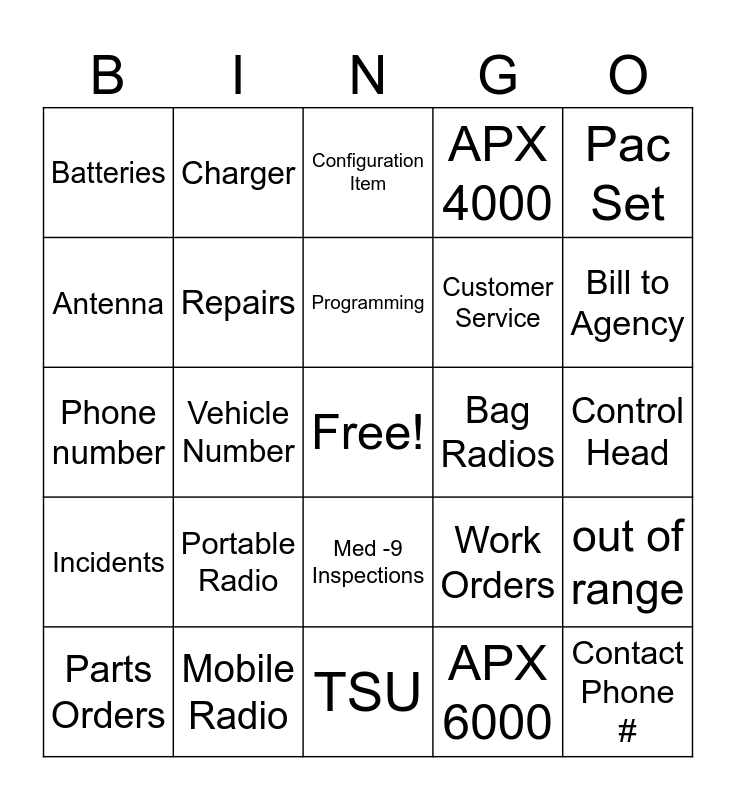 This bingo card has a free space and 24 words: Portable Radio, Mobile Radio, Programming, Parts Orders, Pac Set, Batteries, Antenna, Charger, Bag Radios, Med -9 Inspections, Customer Service, Phone number, Work Orders, out of range, Repairs, APX 6000, Control Head, Configuration Item, Bill to Agency, Vehicle Number, Contact Phone #, Incidents, APX 4000 and TSU.