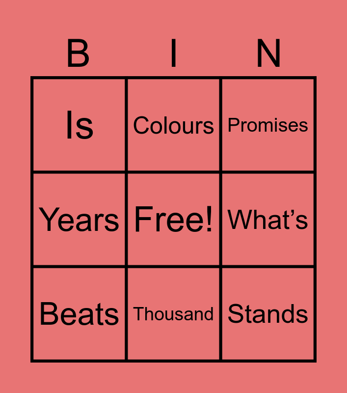 This bingo card has a free space and 10 words: Beats, Colours, Promises, Years, Thousand, Stands, Is, Goes, What’s and Step.
