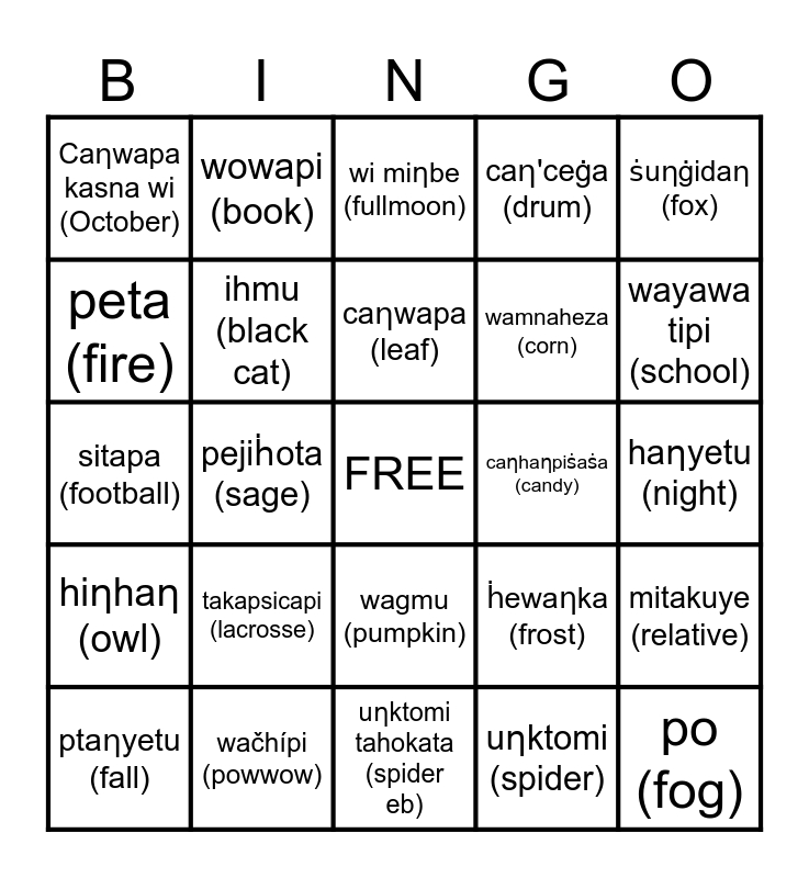 This bingo card has a free space and 34 words: uƞciṡicena (crow), uƞktomi (spider), ḣupahu wakihdakena (bat), kaƞġi (raven), hiƞhaƞ (owl), ihmu (black cat), ṡuƞġidaƞ (fox), ptaƞyetu (fall), wowapi (book), żicataƞka (turkey), caƞwapa (leaf), wi miƞbe (fullmoon), ta'ḣca (deer), ṡuƞgmanitu (wolf), caƞhaƞpiṡaṡa (candy), wayawa tipi (school), wačhípi (powwow), sitapa (football), takapsicapi (lacrosse), ḣewaƞka (frost), wagmu (pumpkin), taspaƞ (apple), Caƞwapa kasna wi (October), haƞyetu (night), uƞktomi tahokata (spider eb), po (fog), caƞ'ceġa (drum), ce'ġa (kettle), wamnaheza (corn), peta (fire), tipsiƞna (turnip), pejiḣota (sage), mitakuye (relative) and woyake (story).