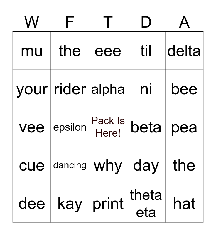 This bingo card has a free space and 51 words: purple, hat, cheetah, print, dancing, on, the, I'll be, your, shotgun, rider, til, the, day, I, die, alpha, beta, gamma, delta, epsilon, theta eta, mu, ni, psi, aye, bee, see, dee, eee, eff, gee, ache, eye, jay, kay, el, em, en, oh, pea, cue, are, ess, tea, your, vee, doubleyou, ex, why and zee.