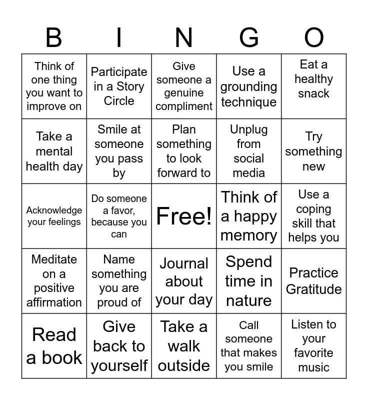 This bingo card has a free space and 24 words: Name something you are proud of, Give back to yourself, Plan something to look forward to, Read a book, Eat a healthy snack, Think of one thing you want to improve on, Take a mental health day, Participate in a Story Circle, Think of a happy memory, Journal about your day, Unplug from social media, Acknowledge your feelings, Spend time in nature, Practice Gratitude, Smile at someone you pass by, Call someone that makes you smile, Use a coping skill that helps you, Give someone a genuine compliment, Try something new, Do someone a favor, because you can, Listen to your favorite music, Meditate on a positive affirmation, Use a grounding technique and Take a walk outside.